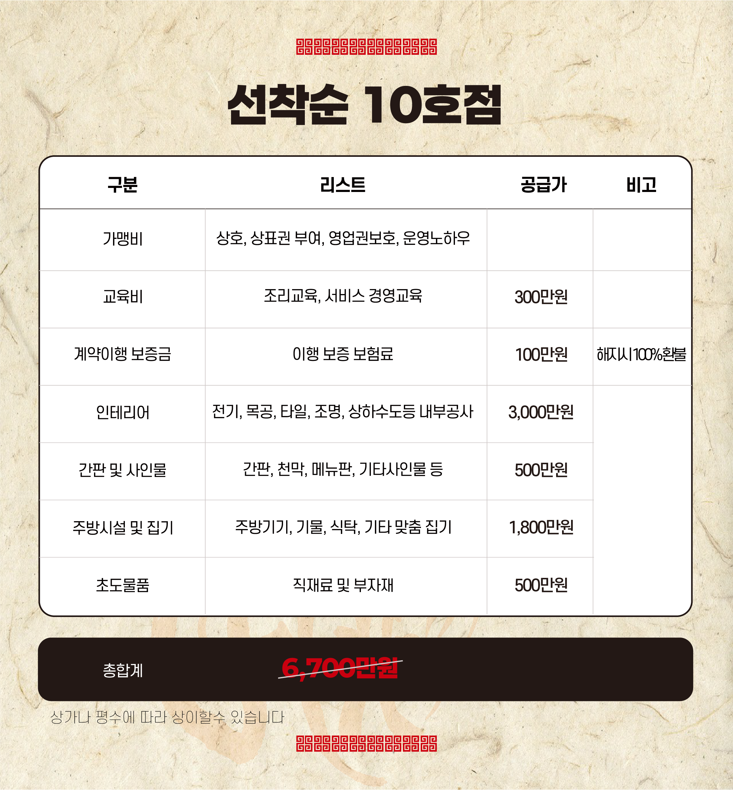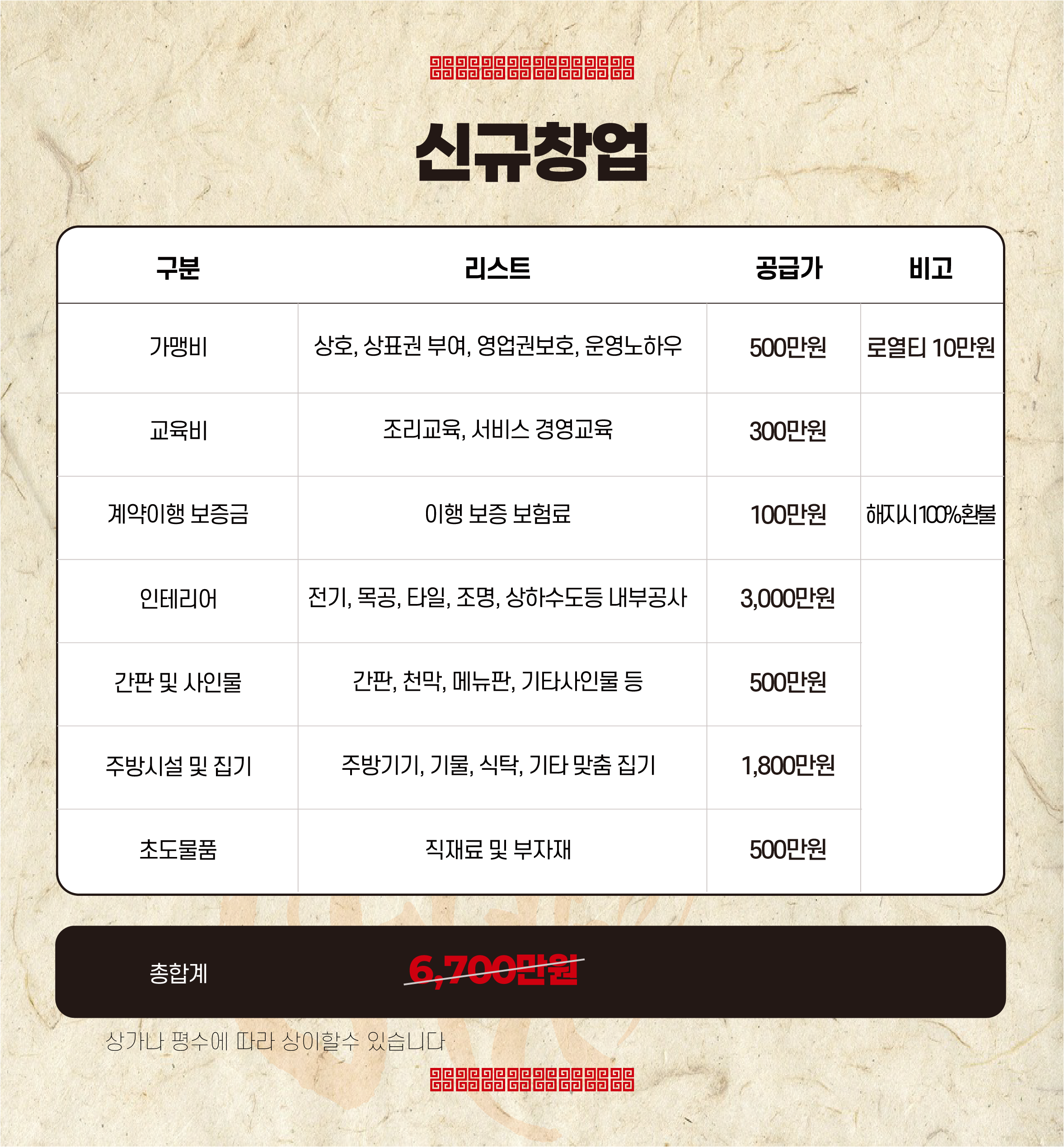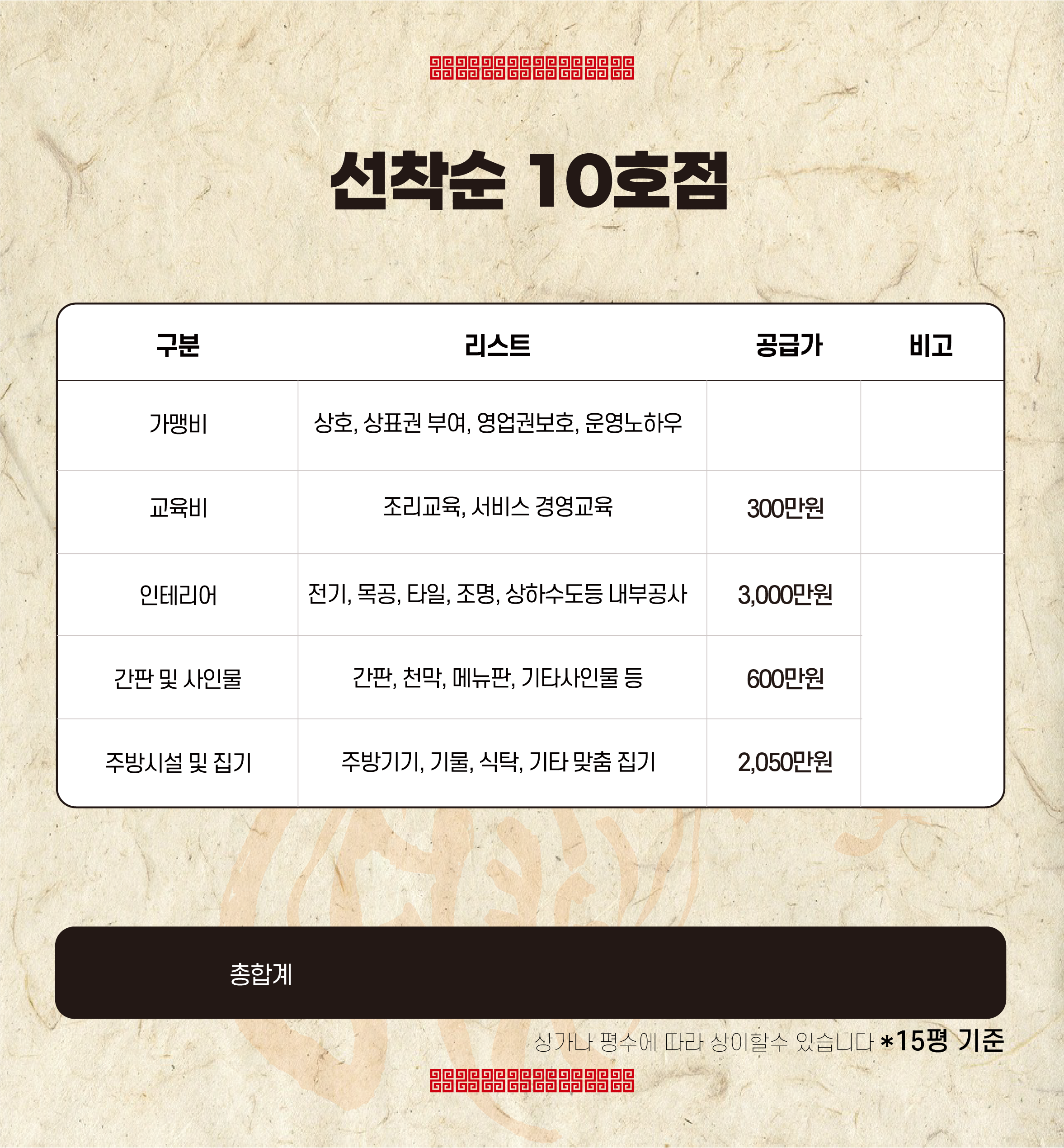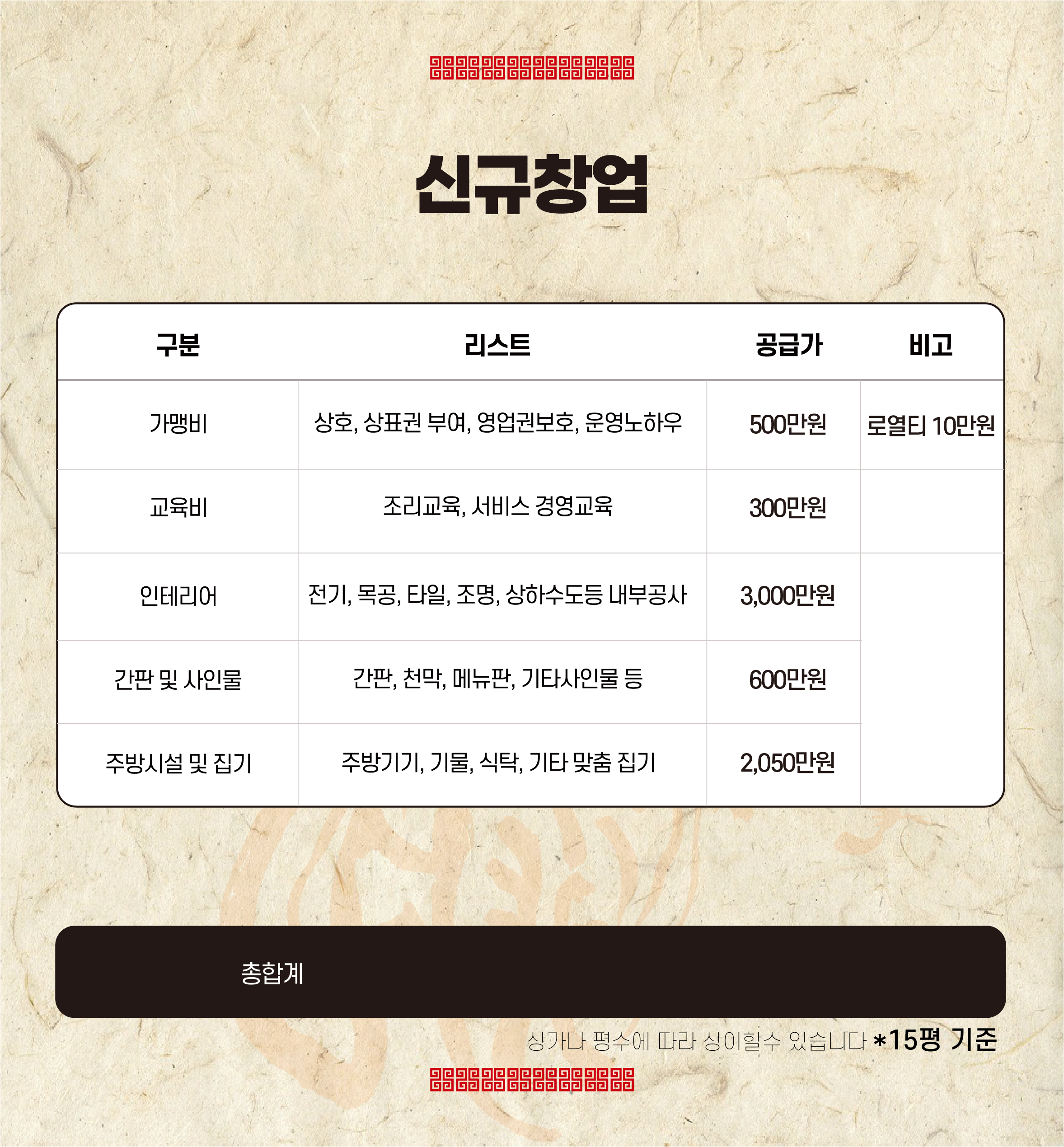 A. 15평 기준 5,700만 원~(가맹비 면제시), 상세 내역 표 참조 부탁드리겠습니다!